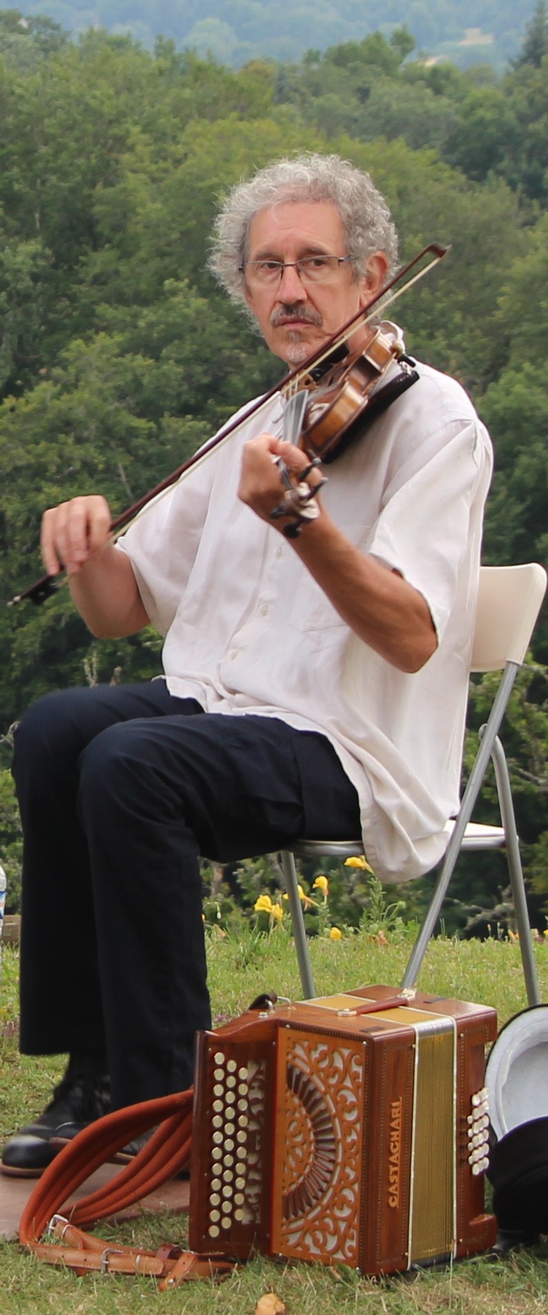 Je n’ai pas grandi dans une famille de musiciens. Gamin, mon père avait voulu que je prenne des cours de violon, classique évidemment : à l’époque ça ne pouvait être que cela. Ce ne fut pas une grande réussite : je n’en ai fait qu’une année et ça m’avait plutôt dégoûté que déclenché une vocation. J’avais bien vu des groupes folkloriques qui jouaient parfois place de la mairie à Limoges quand j’étais ado : ça n’a pas été un coup de foudre. C’est en 1974 que j’ai découvert le folk et le trad. D’abord dans une soirée où jouaient les frères Desaunay, Serge et Patrick, et après dans un bal à la Maison du Peuple à Limoges avec Marc Perrone et Perlinpinpin fòlc. C’était l’époque où venait de sortir le disque culte : Gabriel Valse.