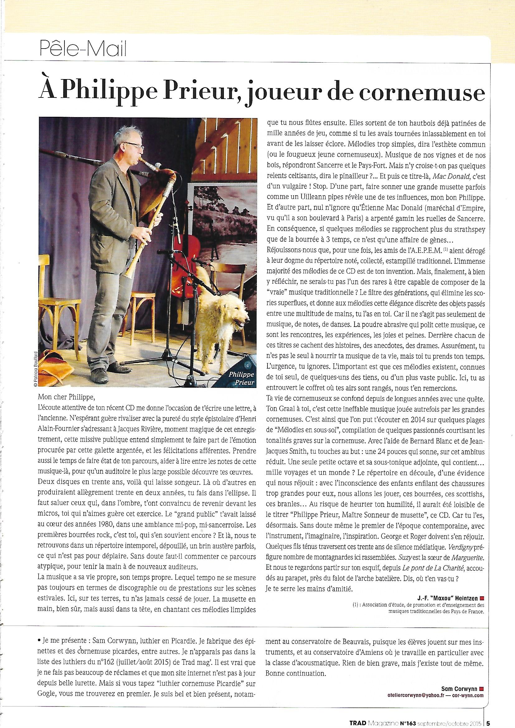 Philippe Prieur, musicien et vigneron nous gratifie de ses belles compositions avec beaucoup de parcimonie depuis le 1er enregistrement réalisé sous son nom et publié en K7 audio en 1985, "Crue d’amour", ré édité en CD par l’Amta en 2001 ! Quant à son dernier disque, il remonte à 10 ans : "Joueur de musette", Aepem 2015 (https://www.aepem.com/produit/philippe-prieur/). Lire en parallèle la lettre à P. Prieur de JF "Maxou" Heintzen publiée dans le n° 163 de Trad’Mag (1). Cette fois-ci, il est entouré de Frédéric Paris (musette 12 pouces, flûte et chant), de Frédéric Baudimant (violon) et de Gilles Chabenat (vielle à roue) qui réalise tous les arrangements de ce magnifique album.